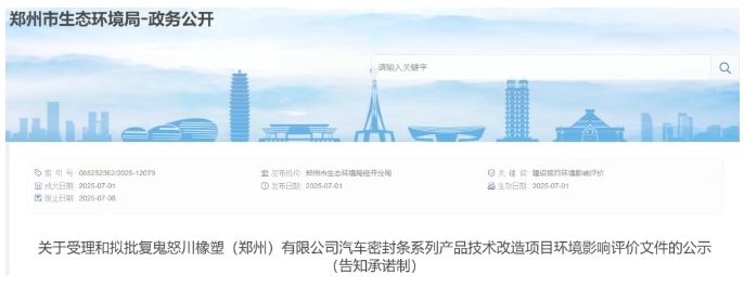 郑州市生态环境局经开分局发布关于受理和拟批复鬼怒川橡塑(郑州)有限公司汽车密封条系列产品技术改造项目环境影响评价文件的公示(告知承诺制)。