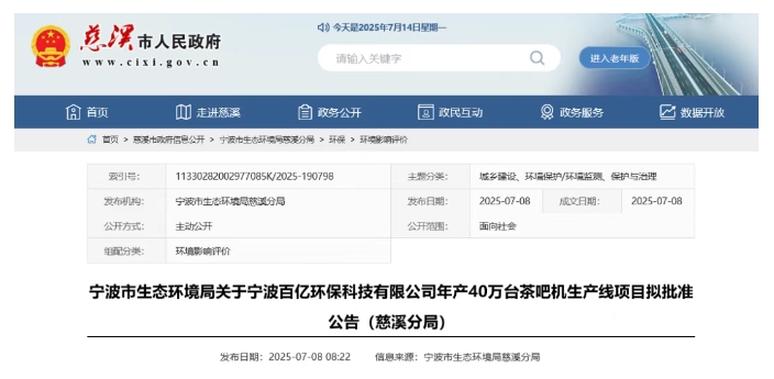 宁波市生态环境局发布关于宁波百亿环保科技有限公司年产40万台茶吧机生产线项目拟批准公告(慈溪分局)。
