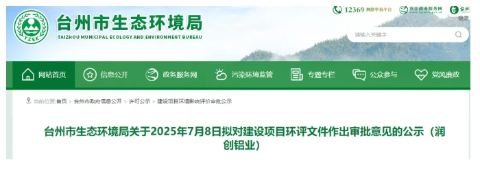 台州市生态环境局发布关于2025年7月8日拟对建设项目环评文件作出审批意见的公示(润创铝业)。