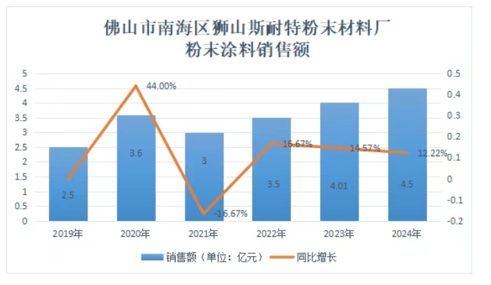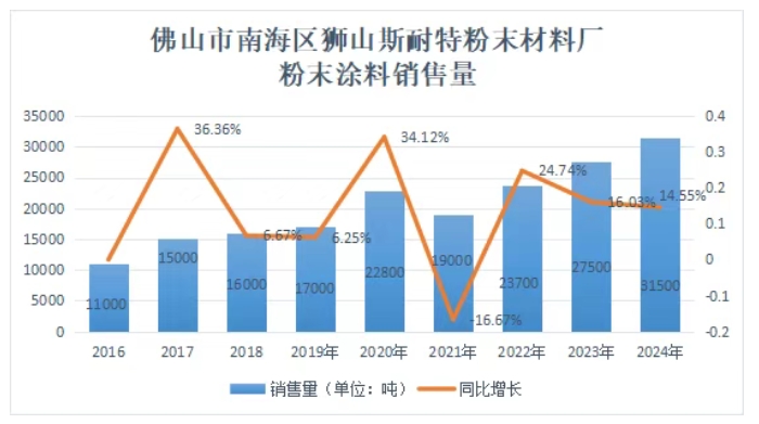 据涂料采购网信息中心数据显示,斯耐特除了2021年受疫情原因影响销售量和销售额下降以外,其余年份都实现了稳步增长,其中2024年相较于2023年销售量同比增长14.55%,销售额同比增长12.22%。