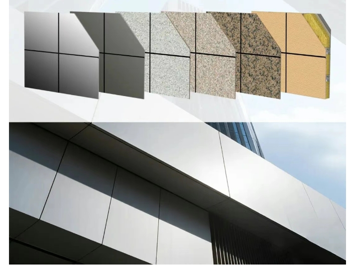 洁士美保温装饰集成系统涵盖水性氟碳金属效果、水性氟碳实色效果、晶彩石饰面效果、多彩饰面效果、花岗岩饰面效果、真石漆饰面效果等,并且可根据客户需求搭配多种保温芯材,为客户提供多元化选择。