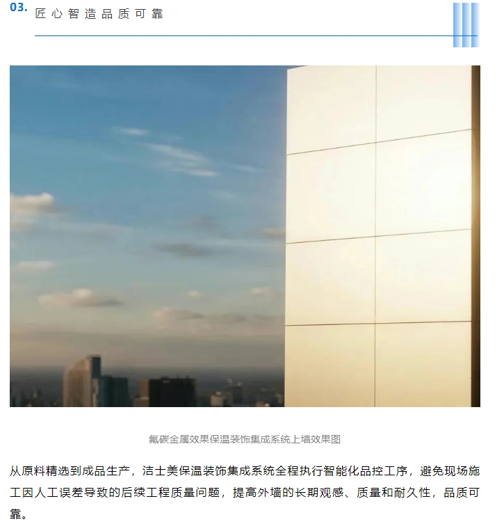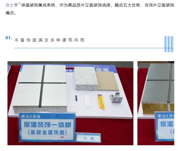 洁士美保温装饰集成系统,不仅仅是建筑的守护者,更是时光美学的缔造者!让建筑承载永恒,让美学永驻时光,洁士美一直在行动!