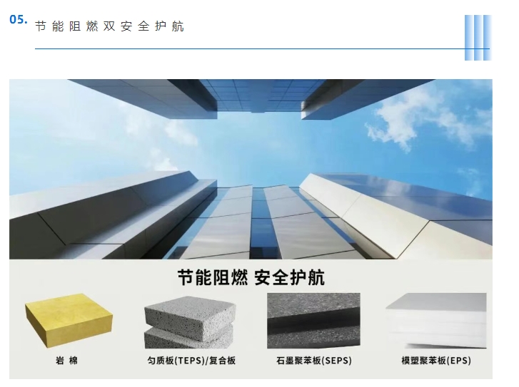 洁士美推出四种保温芯材,包含岩棉、匀质板、石墨聚苯板、模塑聚苯板,高效阻燃节能。饰面层采用高密度硅酸钙板兼具良好的隔音隔热性,全方位节能阻燃,安全双护航。