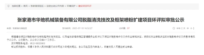 张家港市保税区发布张家港市华地机械装备有限公司脱脂清洗技改及框架喷粉扩建项目环评拟审批公示。