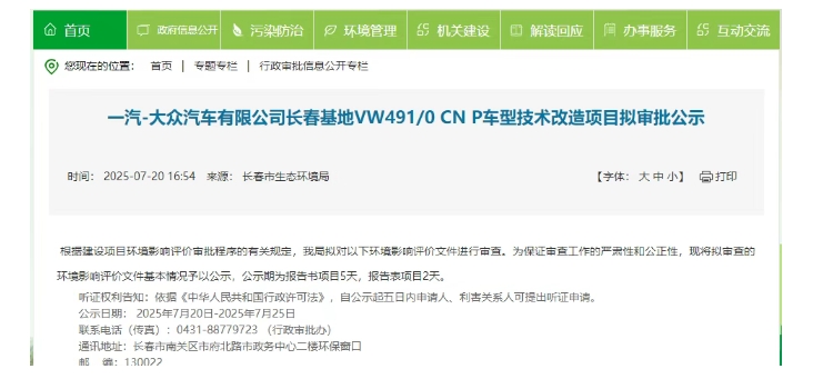 近日,长春市生态环境局发布一汽-大众汽车有限公司长春基地VW491/0 CN P车型技术改造项目拟审批公示。