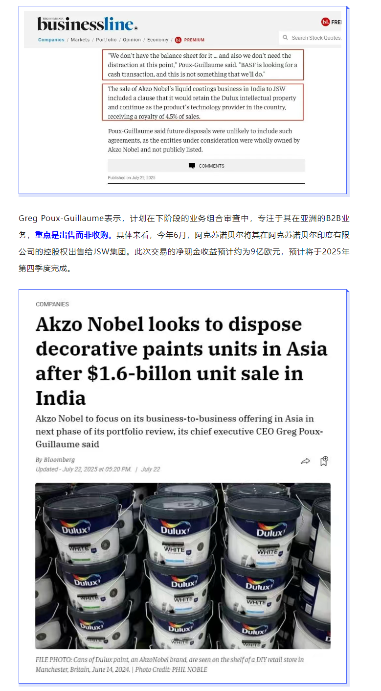 近日,外资涂料巨头巴斯夫剥离涂料业务一事再起波澜,据路透社报道,阿克苏诺贝尔首席执行官Greg Poux-Guillaume被问及“考虑收购巴斯夫的涂料业务”时指出,“阿克苏诺贝尔尚未承诺进行任何这样的程序。”其还表示“我们没有这方面的资产负债表……而且我们现在不需要分心……巴斯夫正在寻求现金交易,而我们不会这么做。”这似乎体现出了阿克苏诺贝尔对于收购巴斯夫涂料业务的“婉拒”态度。