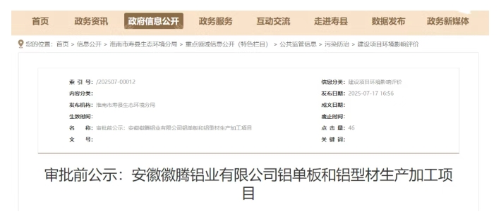 根据建设项目环境影响评价审批的有关规定,经审查,我局拟对安徽徽腾铝业有限公司《铝单板和铝型材生产加工项目》进行审批。为保证审查工作的严肃性、公正性,现将拟作出审批意见的环境影响评价文件基本情况予以公示,公开征求公众意见。