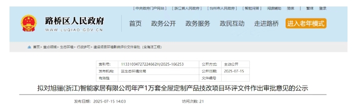 近日,路桥区人民政府发布拟对旭骊(浙江)智能家居有限公司年产1万套全屋定制产品技改项目环评文件作出审批意见的公示。