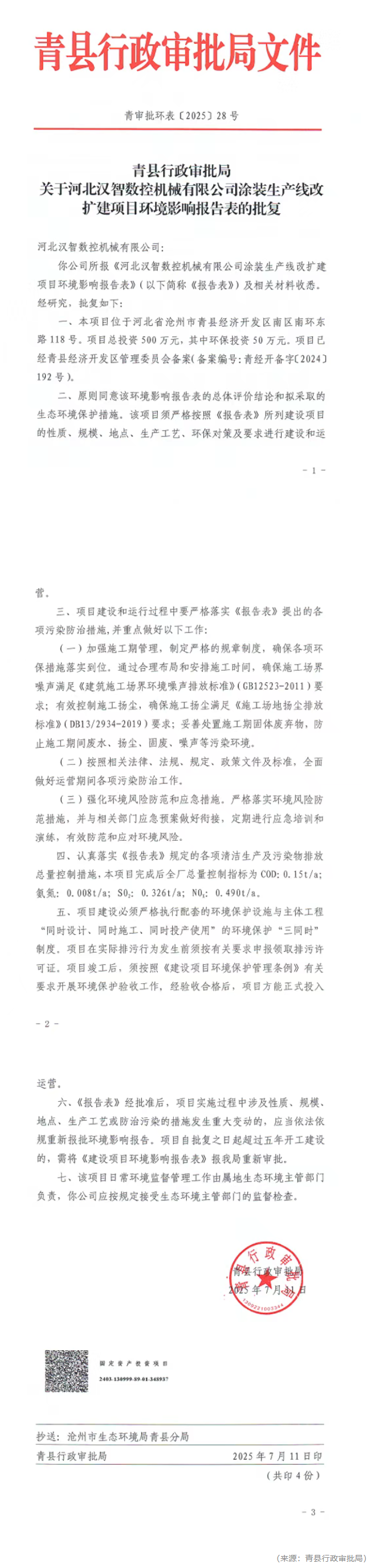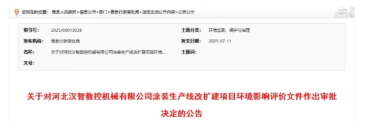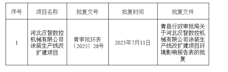 近日,青县行政审批局发布关于对河北汉智数控机械有限公司涂装生产线改扩建项目环境影响评价文件作出审批决定的公告。