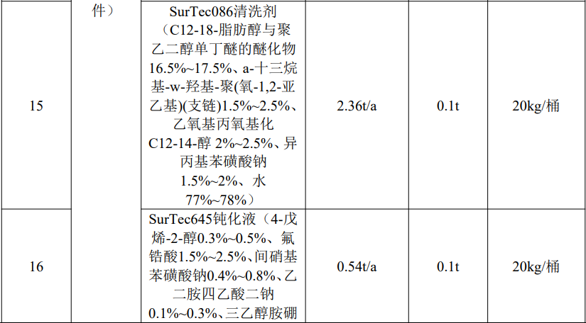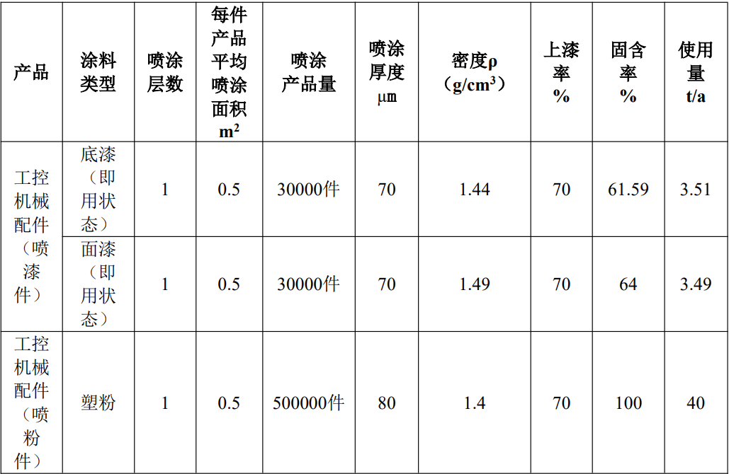根据上表核算内容,底漆与固化剂、稀释剂按照7:1:0.4进行调配,面漆与固化剂按照4:1进行调配。项目使用的溶剂型涂料底漆(即用状态下)年使用量为3.51t/a,面漆(即用状态下)年使用量为3.49t/a。故底漆年用量为2.92t/a,底漆固化剂年用量为0.42t/a,底漆稀释剂年用量为0.17t/a;面漆年用量为2.79t/a,面漆固化剂年用量为0.70t/a;塑粉年用量为40t/a。本次评价采用企业提供的MSDS中数据,按照底漆:固化剂:稀释剂=7:1:0.4、面漆:固化剂=4:1的调配比例,确定本次工程使用涂料主要组分及挥发性有机废气(以非甲烷总烃计)占比情况。