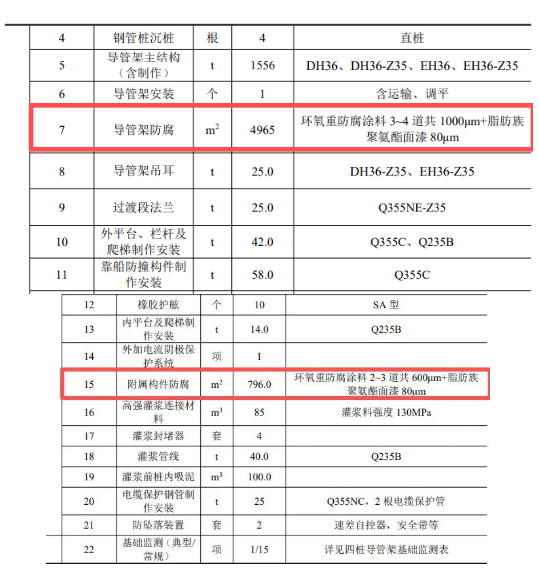 泥下区防腐应采用阴极保护。当采用阴极保护和涂料联合防腐时,泥面以下 3.0m可不采取涂料保护。 内部区的防腐蚀多采用涂层。涂层一般选用富锌底漆加环氧漆即可。 本项目根据风机基础构件所处的不同腐蚀分区,分别采取相应的防腐措施: