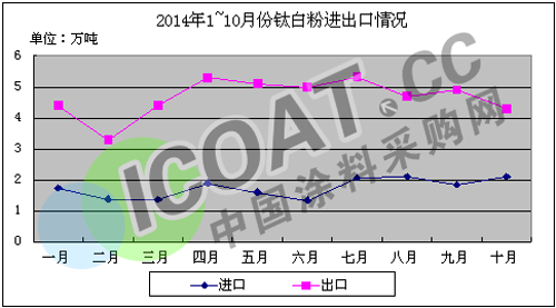 通过上图我们可以看出,2014年国内钛白粉出口量同比都出现了小幅增长,但是进口量自进入8月份之后就开始出现持续性下滑,出口量则在第四季度第一个月出现大幅度下滑,环比下降12.57%。从目前的发展情况来看,11月、12月份国内钛白粉出口量也会以下滑为主,其主要原因是国际钛白粉市场需求下缓所致。