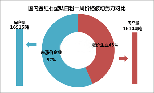 由以上数据可见,规模以上金红石型钛白粉生产企业样本数量为23家,其中涨价数量10家,未涨价企业数量13家,未涨价企业数量相对较多。如果按照产能及开工率核算来看,本周钛白粉产量中,涨价产量为16143.7吨,未涨价产量为16915.1吨,基本持平。分析可见,本轮国内金红石型钛白粉涨价与未涨价的双方实力对比基本持平。