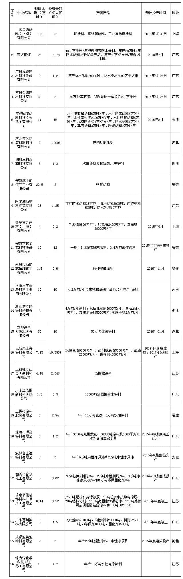 【中国涂料采购网】通过近三十年的发展,国内涂料行业从无到有,从小到大,直到成为全球最大的涂料生产和消费国。即使国内宏观经济进入“常态化”发展,国内房地产行业投资逐渐下滑,国内涂料行业的产量依然保持着5%以上的增长。下面,我们对2015年上半年国内涂料行业新建、扩建及投产情况进行整理,以飨读者。