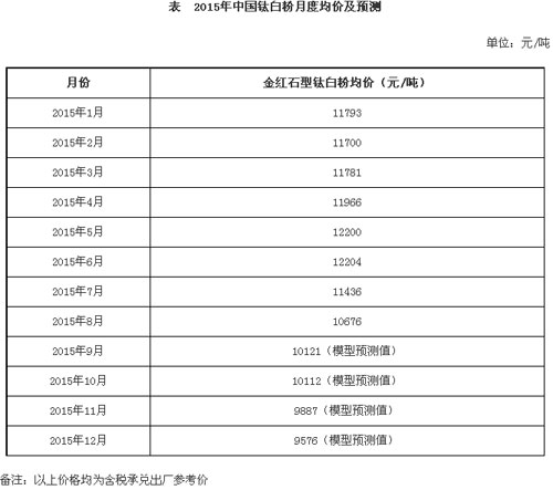 业内人士预测:通过定量数据分析结果可以看到,9月金红石型钛白粉份均价在10121元/吨左右,较8月份环比将继续下跌,而过定性判断可以看出,9月份利好因素确实不及往年,钛白粉市场价格难以借机反弹,卓创认为9月份国内钛白粉价格仍存在继续下跌探底的空间,其中金红石型钛白粉商谈区间在9800-10800元/吨,锐钛型钛白粉商谈在8800-9800元/吨(均承兑含税)。