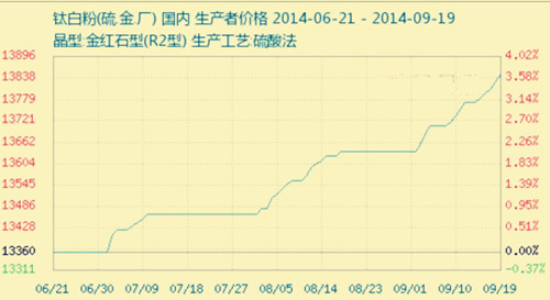“金九”到来,国内金红石型钛白粉市场利多开局,跟涨有先后,中旬的市场已接近平稳,不管是真正提价还是“明涨实稳”,第六次调涨的气氛已经形成。经过半年的涨价,钛白粉的整体价格水平已提升千元以上,无奈实际成交的价格永远是一个矛盾体,生产商或经销商希望利润最大化,下游客户希望成本最低化,最终目标都是希望赚现钱、多赚钱,经过几番调涨下游采购商尽管艰难,但也在渐渐接受,供需价格平衡点已侧移,试探性的改变就是在发现生产商、经销商生存“舒服”,下游采购商接受“不困难”的“黄金分割点”,市场不是理想的模型,所以这样的“平衡点”总在利益的周围摆动,永无休止。时至第三季度末,钛白粉概念股的若干上市公司面临出第三季报,或就此加强与龙头企业横向联系,再加一波逆涨,逞威第三季度末,至少为季报“添彩”,也为钛白粉后市利多增加一小块砝码。目前国内多数硫酸法金红石型和锐钛型钛白粉的主流报价在12100-13900元/吨和9500-10800元/吨(均含税)。