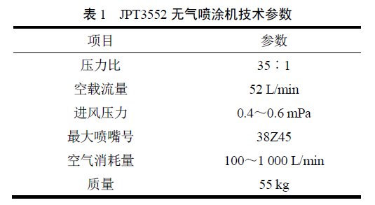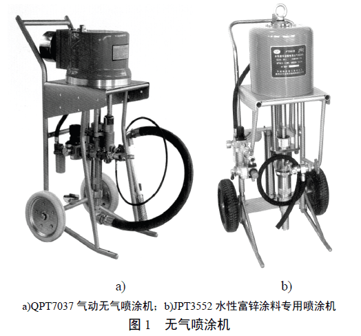 对于水性富锌涂料的无气喷漆应采用独特的专用喷漆机,目前专用机尚未完全普及。JPT3552 无气喷涂机为重庆机械厂研发的专喷水性有机、无机富锌底漆。国外生产的水性涂料专用喷漆机的主要构件是用不锈钢材料。图1 为两种型号无气喷涂机。