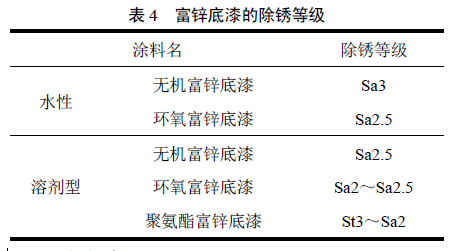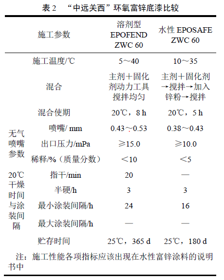 重防腐水性富锌底漆的施工性能是由富锌底漆的内在品质所决定的,它是水性底漆的技术指标之一,是确保产品可靠性的关键,是涂装工艺设计的基础。施工性能包括:对表面处理的要求、无气喷漆的技术条件、环境温度和湿度、干燥时间与涂装间隔、熟化时间与混合使用期、专用稀释剂类型和稀释比、覆盖率。水性富锌底漆与溶剂型富锌底漆在施工性能上有较大的差异,见表2。