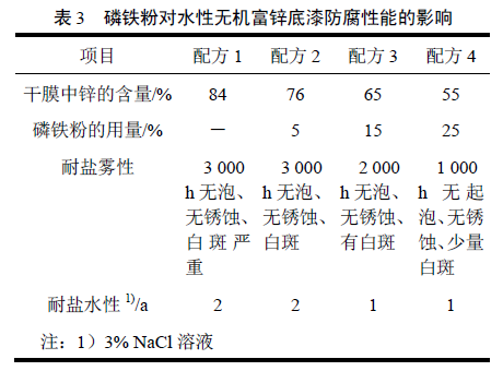 不同厂家生产的水性富锌底漆因成膜树脂、原材料来源、配方成份、锌粉含量等各不相同,施工性能也有很大的差异。特别是磷铁粉的加入能提高水性无机富锌底漆的施工性能。无气喷漆时,加入磷铁粉的水性富锌底漆容易,搅拌均匀,喷漆流畅;一次喷漆可达较高膜厚。并可降低涂层龟裂趋势;实验证明,水性富锌底漆中添加适量的磷铁粉,可不使用封闭底漆。但必须经过试验,磷铁粉的加入量一般控制在15%以内,以免影响防锈性能。