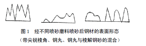 水性富锌涂料对机械除锈后的粗糙度值要求较高,特别是水性无机富锌底漆Rz≈50~75 μm;在磨料的选择和配合度上,应适当增加棱角钢砂的份额,使粗糙度的形状成尖锐状(图1),以增加水性富锌底漆与钢材的附着力。