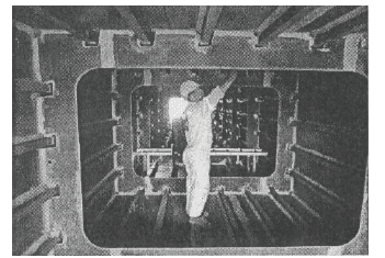 针对水性富锌涂料具有尖锐边缘高收缩性的特性,对于钢构件表面的切割、电焊缝等尖锐边缘实现仔细摸出圆角;对于点焊、铆钉接缝、跳焊部位尖锐边角等,均需采取预涂措施:(1)自由边——钢材自由边上的尖角毛刺,用砂轮打磨至r=2 mm 的圆角;(2)切割边——切割边的峰谷差超过1 mm 时,打磨到1 mm 以下,坚硬的熔渣表面要进行打磨处理;(3)咬边——焊缝上深为0.8 mm以上的咬口,进行补焊处理;(4)飞溅——焊接产生的飞溅要打磨光顺;(5)剥落——钢材表面的剥落,用砂轮修整;(6)凹坑——深度在0.8 mm 以上的要补焊处理;(7)焊缝——焊缝接头,以及表面有2 mm 以上的突出或有锋利突出时,砂轮打磨光顺;(8)切割面——尽管光顺,但是由于非常坚硬不利于喷砂,要先打磨掉表层。重BETVLCTOR伟德登录入口 的涂装工艺,预涂是关键和瓶颈,一般在表面缺陷处理后,马上进入预涂装阶段。图2为“振华”港机在钢梁内部的预涂装,使用的是美国TENEC 环氧厚膜型水性涂料。水性涂料施工中,所有构件的接头等都应紧闭,以免水分进入。预涂工作应十分仔细与到位,这方面教训十分深刻