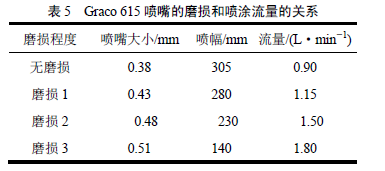 根据水性富锌底漆的规定膜厚和待涂钢结构的形状,选择合适孔径大小和喷嘴,这是保证涂层质量和耗漆量的关键。由于材质上的差异,喷嘴推荐采用国外厂家(如Graco、WIWA、Wagner 等公司)的产品,若采用重庆长江机械厂生产的,一定要选用富锌底漆Z 型专用喷嘴。在施工中,并随时注意孔径和喷嘴的变化。喷水性富锌底漆的喷嘴磨损严重,喷孔变大变圆,流量增大,不仅会严重影响漆膜的外观质量及膜厚质量而且成倍增加耗漆量。表5列出喷嘴的磨损和喷涂流量的关系。