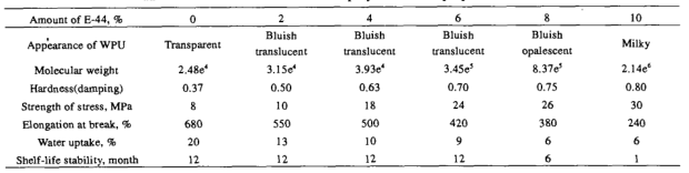 T ab le 2 T h e ef f ect of th e am ou nt of epo x y resin on th e p rop erties of W P U