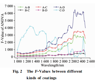 每种涂料从近红外高光谱图像中随机选取200个像元样本点,利用 ANOVA 计算在每个波段(共239个)各类别组合(共