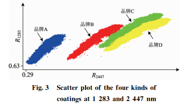 图3是1283和2447nm 两个波段的二维散点图,从图3可见所有像元分为四个集群,品牌 A,B和 C 之间完全可以区分,但 C和 D之间存在部分重叠。