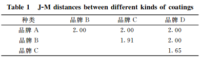 (2)通过 ANOVA 方法并结合统计量 F 值,发现1283和2447nm 两个波段为区分四种建筑涂料的最优波段。构建比值指数犚1283/犚2447 并计算不同品牌涂料之间的J-M 距离,发现比值指数 R1283/R2447 除了品牌 C 和 D 之间的J-M距离小于1.8外,其他品牌涂料之间的J-M 距离均大于1.8,说明该指数在区分品牌 C与 D组合时部分像元易发生混淆,而其他品牌之间均完全可以区分。