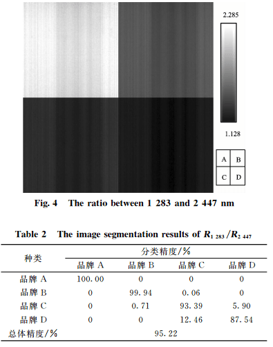 对图4 进 行 灰 度 阈 值 分 割,其 分 类 结 果 见 表 2。可 知R1283/R2447比值指数能将“品牌 A”、“品牌 B”与其他类别完全区分,尽管品牌 C和品牌 D之间存在着一定重叠,但其分类精度仍达到在87%以上,可以满足实际应用需求。