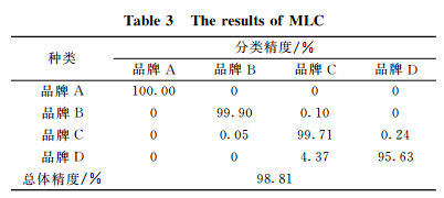 利用 ANOVA 随机选择的800(每类200)个像元作训练样本,其他所有像元作为测试样本,以1283和2447nm 两个波段作为特征并利用高斯最大似然分类器进行分类,总体精度为98.81%,分类结果见表3。可见利用最大似然分类的精度要明显高于比值指数 犚1283/犚2447 阈值分割结果(品牌 C和品牌 D的分类精度也在95%以上),这主要因为阈值分割将比值图像强行分割为四类,而最大似然分类是将每个像元判给类归属概率最大的类别[20],其决策更具有可靠性。