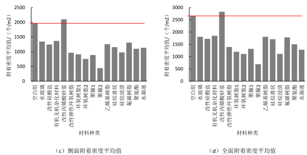 空白和带涂层试件上的淡水壳菜的附着个数见表 2 所示。附着个数除以附着面积即可得到平均附着密度,各涂料不同部位的平均附着密度如图 2 所示,除改性丙烯酸砂浆外(由于施工工艺的原因导致涂层表面粗糙不平,图 3),其余涂料的附着密度均低于空白组,说明其余涂料确实有效降低了淡水壳菜的附着。从各涂料顶面附着密度平均值来看,空白组的附着密度为 1689 个/m 2 ,防附着效果排在前列的几种材料(低于空白组附着密度的 50%)分别是聚脲 2、环氧树脂 2、聚脲 1、环氧树脂 1、改性弹性环氧树脂、永凝液和硅烷浸渍,其中聚脲 2 的附着密度是空白组的 18%(图 2 a);从各涂料底面附着密度平均值来看,空白组的附着密度为 6400 个/m 2 ,防附着效果排在前列的几种材料(低于空白组附着密度的50%)分别是硅烷浸渍、聚脲 2、永凝液、环氧树脂 1和环氧树脂 2,其中硅烷浸渍的附着密度是空白组的 37%(图 2 b);从各涂料侧面附着密度平均值来看,空白组的附着密度为 1967 个/m 2 ,防附着效果排在前列的几种材料(低于空白组附着密度的 50%)分别是聚脲 2、环氧树脂 2、聚脲 1、环氧树脂 1、改性弹性环氧树脂和硅烷浸渍,其中聚脲 2 的附着密度是空白组的 23%(图 2 c);从各涂料全面附着密度平均值来看,空白组的附着密度为 2659 个/m 2 ,防附着效果排在前列的几种材料(低于空白组附着密度的 50%)分别是聚脲 2、环氧树脂 2、环氧树脂 1、硅烷浸渍、永凝液和聚脲 1,其中聚脲 2 的附着密度是空白组的26%(图 2 d)。综上所述,在试件各部位均附着较少的涂料有聚脲 2、环氧树脂 2、环氧树脂 1和硅烷浸渍。