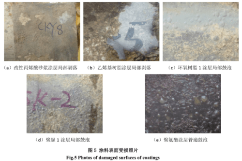 从各涂料在受侵蚀 9 个月后的表面完好程度来看,改性丙烯酸砂浆和乙烯基树脂产生了局部剥落现象(图 5a 和图 5b),环氧树脂 1 和聚脲 1产生了局部鼓泡的现象(图 5c 和图 5d),聚氨酯产生了普遍鼓泡的现象(图 5e)。因此,这些涂料的耐久性不符合要求,应予以排除。
