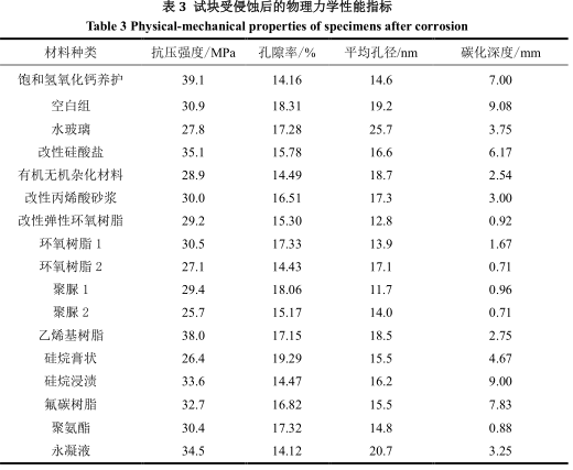 由于表层孔隙特征受取样随机性的影响较大,抗压强度受涂刷龄期的影响较大,因此主要从抗碳化性来评判各涂层抗侵蚀性的优劣,但聚氨酯和聚脲 1 在浸泡一段时间后会产生鼓泡等现象,影响耐久性,因此从抗侵蚀性和耐久性综合来看,聚脲 2、环氧树脂 2 和改性弹性环氧树脂是较优的涂料。
