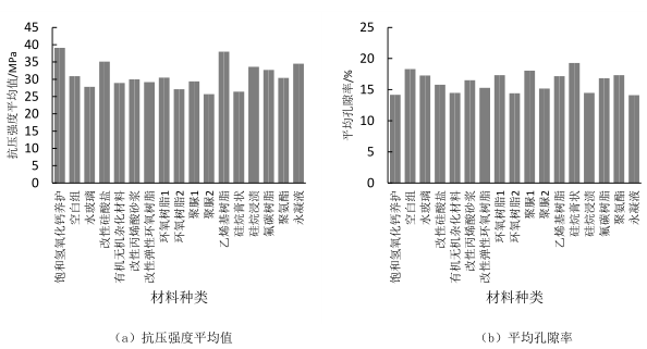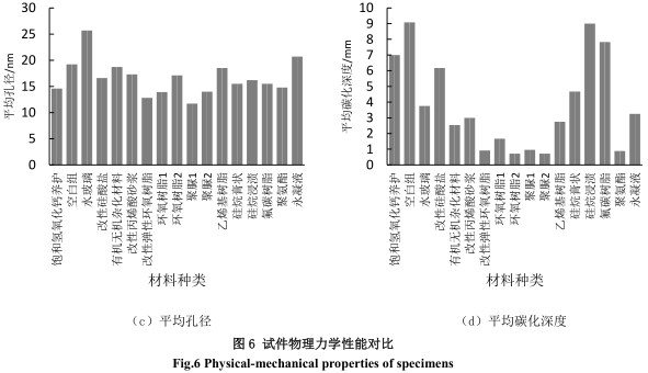 对于防附涂料的抗侵蚀性,硅烷浸渍、氟碳树脂、改性硅酸盐、乙烯基树脂和永凝液对提高抗压强度效果较好;永凝液、硅烷浸渍、聚脲 2、环氧树脂 2 和有机无机杂化材料对于降低孔隙率效果稍好,聚脲 2、改性弹性环氧树脂、聚脲 1 和环氧树脂 1 对于降低平均孔径效果最明显;聚脲 2、环氧树脂 2、改性弹性环氧树脂、聚氨酯和聚脲 1 的抗碳化效果最明显,而硅烷浸渍和氟碳树脂对于抑制碳化几乎没有效果。