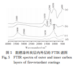 图5的红外谱图中,曲线(1)与(2)分别是加有50份 LDH的阻燃涂料燃烧后炭层的内层与外层,曲线(C)与(D)分别是不含LDH的阻燃涂料炭层的内层与外层。从两种涂料炭层内外层的FTIR谱图中可以看出,内层曲线(a)和(c)的特征峰分别多于外层曲线(b)和(d)的特征峰,在炭层内层结构中,1250~1300cm-3范围内的P=O特征峰结构得到更完整的保留,原因是阻燃体系中的 APP和 PER发生酯化反应,交联形成立体网状结构、构成炭层、同时产生气体发泡,形成膨胀炭层,能够有效阻隔氧和热量的传递,很好地保护内层物质,使得内层的特征峰得以保留。