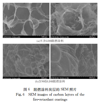 从图6(a)可以看出,不含LDH的涂料燃烧后形成的炭层不均匀,结构疏松,膨胀炭层内只有大孔结构,孔洞大小不均匀而且数量少,在炭层断面不具备多孔海绵状结构[11]。由于其炭层强度不够,易被火焰破坏,故其耐燃时间短,仅为58min。从图6(b)可以看出,加入50份LDH 的涂料燃料后炭层呈大量均匀致密的泡状蜂窝结构,且气泡大小均匀,炭质层表面存在山脉状的海绵状结构,这些结构保证了膨胀炭化层具有较高的强度,微小气孔数量增加,降低了膨胀炭层整体的导热系数,使得通过膨胀炭层传导到基材的热量明显减少,起到良好的隔热防火的作用[2-14]。因而其耐燃时间延长到165min。这说明LDH的加入有效提高了涂料膨胀炭化层的整体强度,可以为基材提供有效防护。