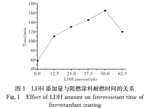 环氧树脂为100份,LDH添加份数在0~62.5份之间,,测定环氧树脂阻燃涂料的耐燃时间,结果见图3。