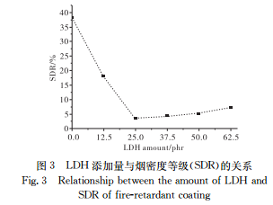 由图2可知,未加入LDH的阻燃涂料在燃烧60s处最大烟密度高达50%左右,而加入不同份数的LDH后,阻燃涂料产生烟雾的时间不同程度的推迟,并且生烟总量都有降低。加入12份LDH涂料烟密度降低至不到30%;加入25份LDH后,烟密度仅为8%左右。由图3可知,随着 LDH添加量的增加,SDR呈现先降低后增高的趋势。在加入25份水滑石后,SDR由38降低至3.4;LDH为50份时,烟密度等级也仅为4.9。这表明LDH在阻燃涂料中有很好的抑烟效果。