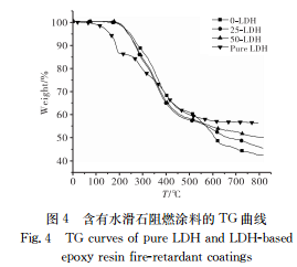 不同含量LDH对阻燃涂料热稳定性的影响如图4的TGA曲线所示。