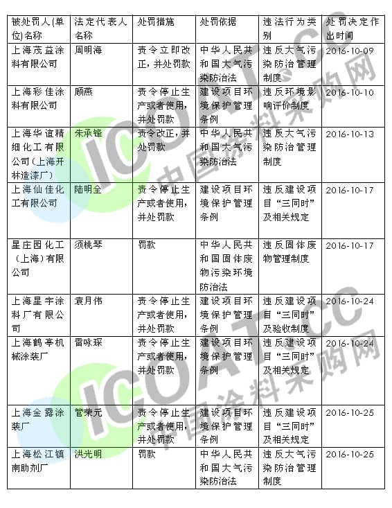 2016年10月份上海市环保局处罚企业名单(涂料、原料部分)