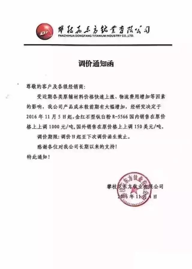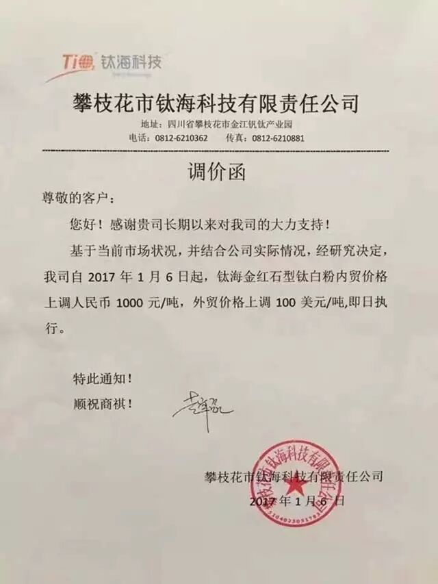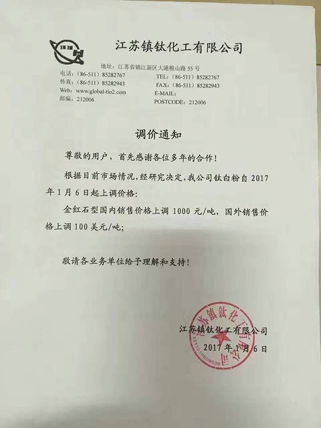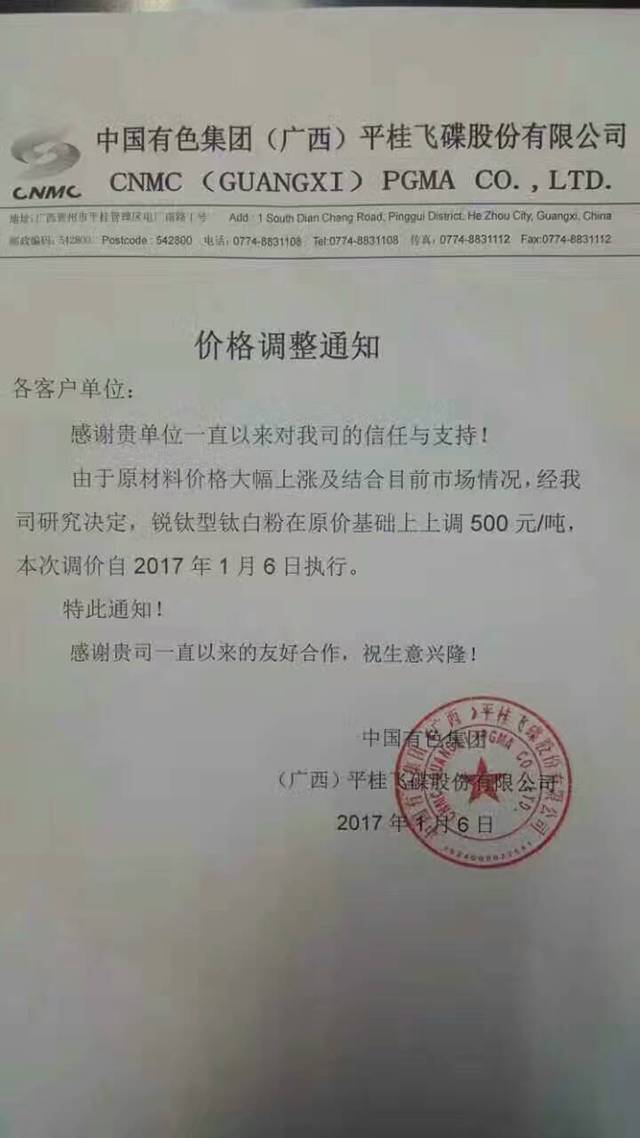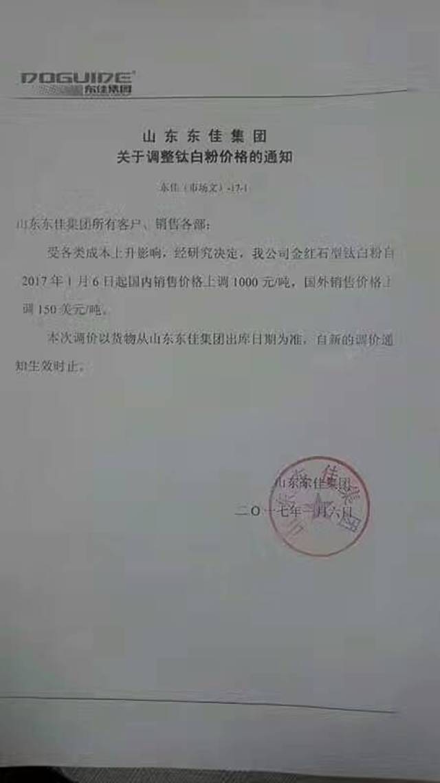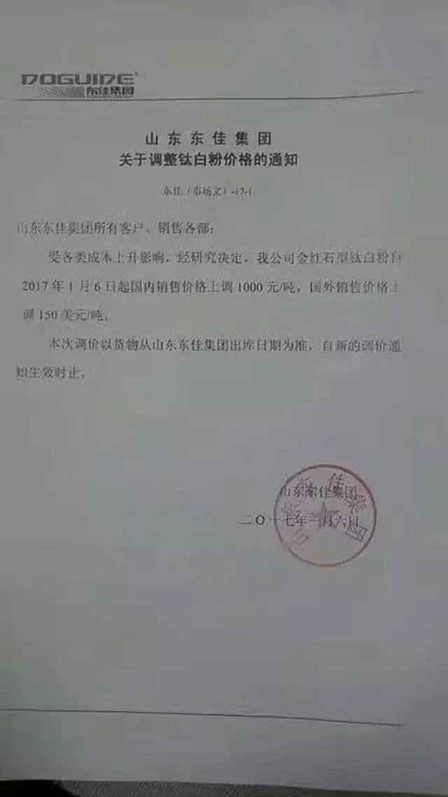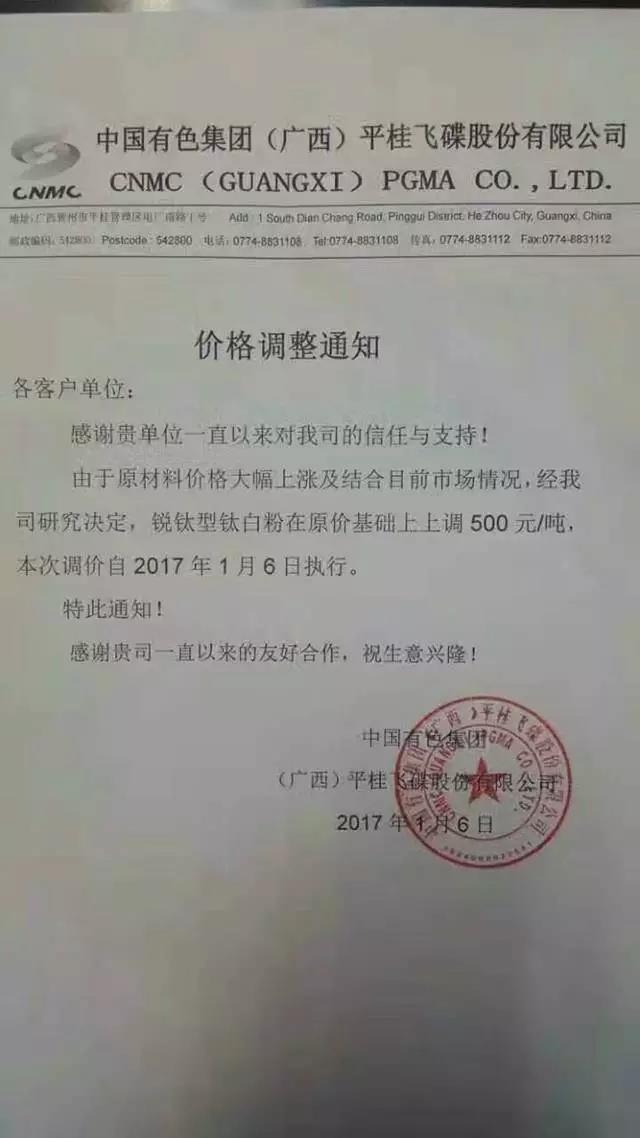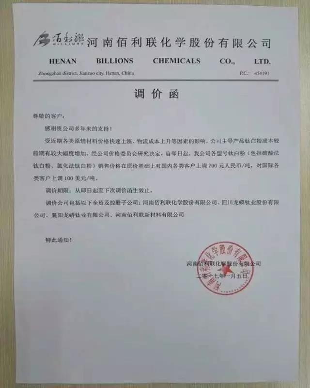 【中国涂料采购网】继2016年钛白粉十几连涨之后,2017年开春之际,钛白粉企业按耐不住,开始上调产品价格,佰利联1月5日晚间发布公告,称自即日起,各型号钛白粉(包括硫酸法钛白粉、氯化法钛白粉)销售价格在原价基础上对国内各类客户上调700元/吨,对国际各类客户上调100美元/吨。此次涨价是佰利联继2016年11月2日提价后的又一次提价。继昨日钛白粉龙头企业龙蟒佰利联提价后,1月6日平桂飞碟、山东东佳、江苏镇钛化工、攀枝花钛海科技、攀枝花东方钛业等钛白粉企业宣布集体提价,上涨空间在500元/吨-1000元/吨之间,这是2017年钛白粉企业的首次提价,对涂料行业的影响意义深远。