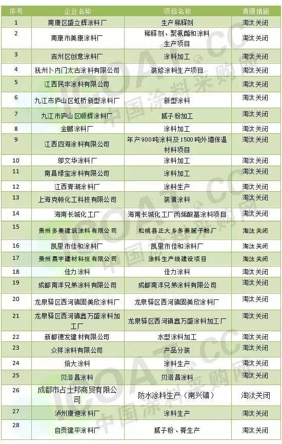 四川、江西、贵州等省市被淘汰关闭涂料项目与企业
