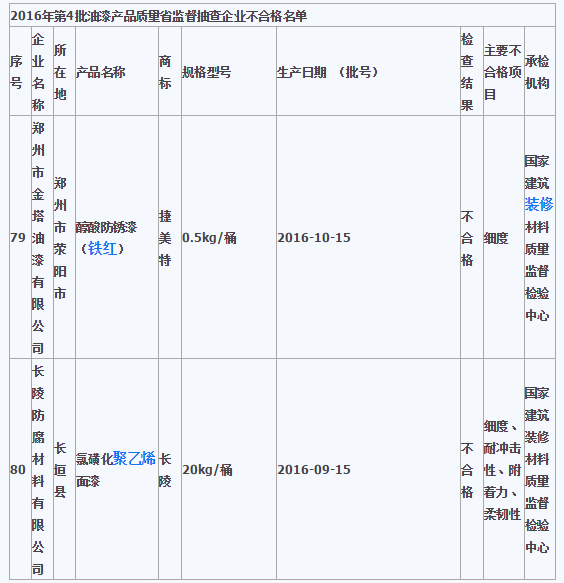 【中国涂料采购网】河南省质量技术监督局于2016年第4季度对床上用品等43种产品质量进行了省监督抽查,并于2017年2月10日在其官网将抽查结果予以公布。本次抽查共抽取了郑州、开封、洛阳、平顶山、新乡、濮阳、南阳、商丘8个省辖市和邓州、长垣2个省直管县(市)32家企业生产的80批次油漆产品,有2批次产品不符合标准的要求。