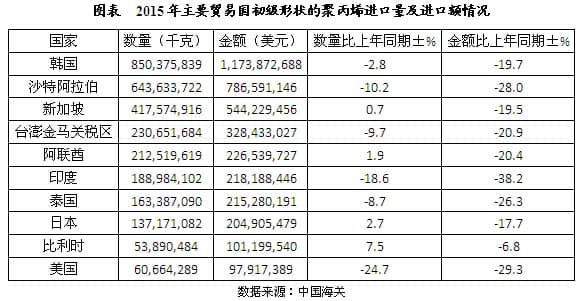 2015年,我国初级形状的聚丙烯进口额排名前五大市场为韩国、沙特阿拉伯、新加坡、台澎金马关税区、阿联酋。其中,进口额最高的是韩国,为1,173,872,688美元,比上年同期下降19.7%;其次是沙特阿拉伯,为786,591,146美元,比上年同期下降28.0%;最低的是阿联酋,为226,539,727美元,比上年同期下降20.4%。