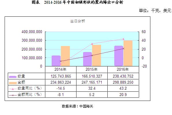 2014-2015年,我国初级形状的聚丙烯出口总额由234,863,224美元增长到247,165,171美元,增长了5.2%;2016年,我国初级形状的聚丙烯出口总额为298,889,250美元,比上年同期增长20.9%。