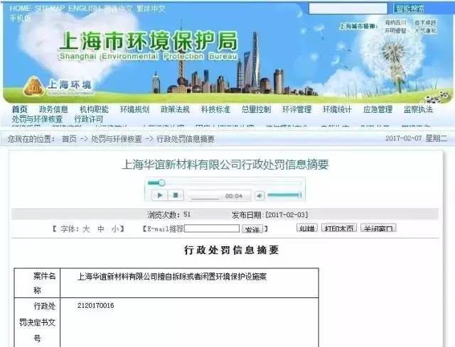 2017年2月3日,上海市环境保护局在其官方网站公布“上海华谊新材料有限公司行政处罚信息摘要”,信息摘要显示,上海华谊新材料有限公司因擅自拆除或者闲置环境保护设施而违反了《上海市环境保护条例》第四十二条第三款的规定。