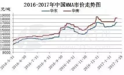 市场是一双无形的手,2017年我国国内甲基丙烯酸甲酯愈演愈烈的供小于求的局面,刺激了国内甲基丙烯酸甲酯市场无可置疑的积极探涨,然而春节后期短短十几个工作日内接近千元的市价涨幅或许仅仅是个开始。随着2017年第一季度、第二季度上海璐彩特、惠菱化成、上海赢创等甲基丙烯酸甲酯生产企业陆续进入停车检修节点,市场整体供应严重紧缺的局面或将加剧,市场价格唯有持续高位探涨一条途径。
